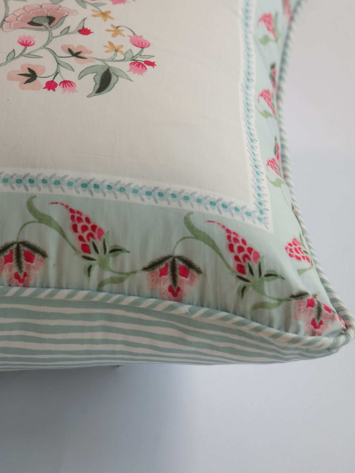 The Firdaus Cushion Covers pair heritage-inspired florals with rhythmic stripes, echoing the collection’s theme of quiet luxury and timeless design.