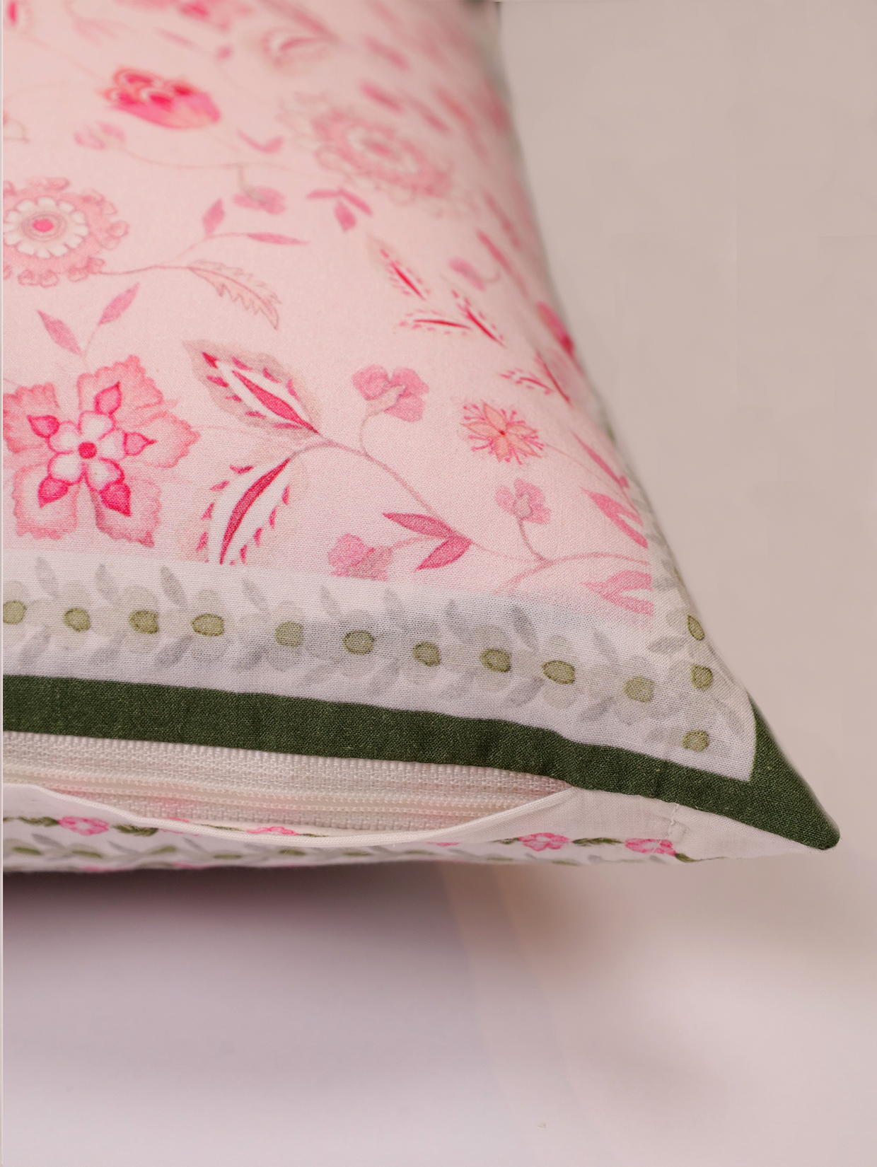 A gentle nod to Mughal symmetry and floral romance, the hand-painted motifs flow across the surface in soft pinks, drawing from the poetic charm of garden beds in full bloom. The design feels both intentional and effortlessly refined.