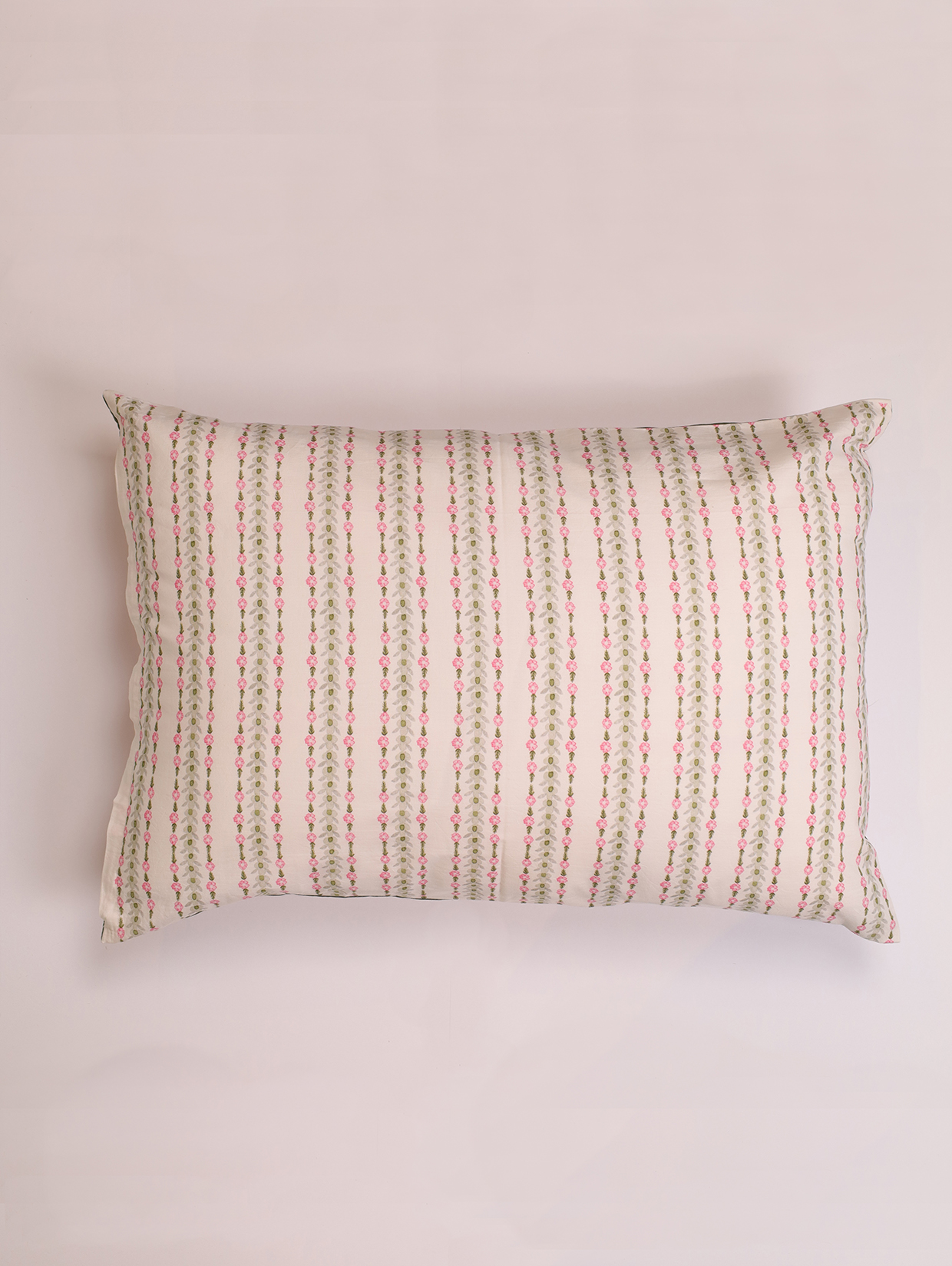 The Nishat Bagh Combo Set - featuring a generously sized percale bedsheet with matching double-sided pillow covers and a pair of quilted mulmul cushion covers - celebrates Mughal symmetry and soft floral romance. Hand-painted motifs in gentle pinks flow across the pieces, capturing the poetic charm of a garden in bloom.
