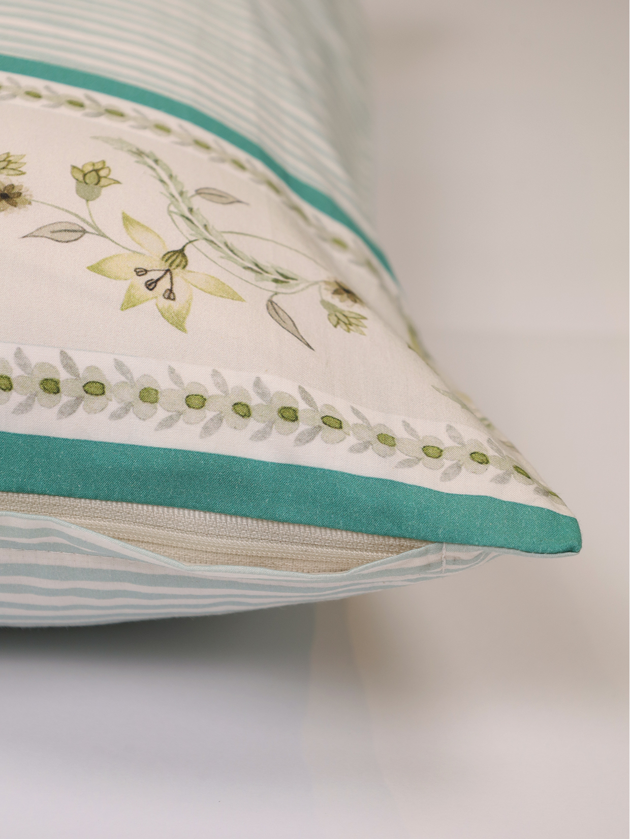 The Firdaus Bedsheet Set is rooted in the idea of  a dreamlike garden of quiet beauty - it pairs heritage florals with rhythmic stripes, capturing a serene, balanced charm.